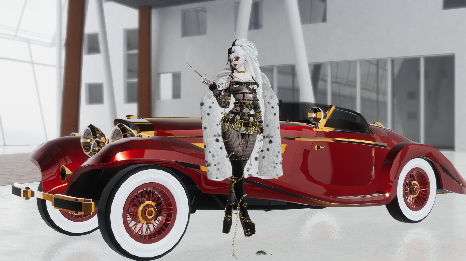 Head | Body | Bodysuit & Socks | Fishnet top & skirt, Boots 1 & Glasses | Belts, Outfit, Boots 2, Coat | Chain Leg | Arms Chains | Ponytail | Short | Long Hair | Panty | Pasties | Cigarette
