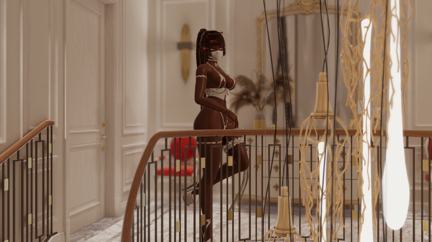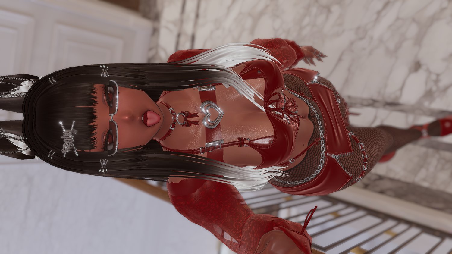 Chain | Earrings | Necklace | Rings | Fishnet | Glasses on head & off | Face mask | Garter | Straps