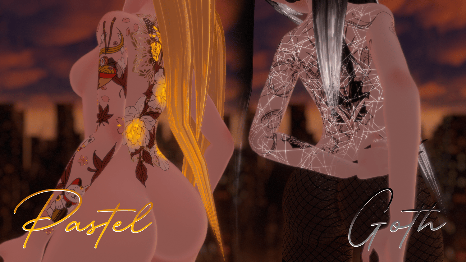 Pastel & Goth -> 6 materials, 6 Textures with tattoos (Only Fishnet x2, Only Tattoos x2, Combo x2), 6 png (Only Tattoos), 17 masks, 6 Normal maps