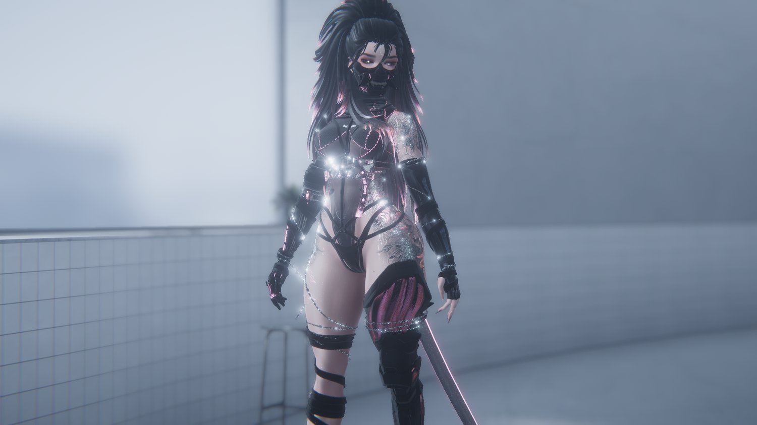 Body | Head, Hair textures & Short & Fluffy Hair | Ponytail, Long Hair, Shorts & Sleeves | Bodysuit | Pasties | Samourai Hat by Hokko | OniMask by Alternate Universe | Helmet by AnimaZ | Cap | Horns & Crop Top | Body chain | Harness | Neck | Arm | Spine | Leg | Hoodie, Face Mask & Simple Boots | Fit Undies | Cyber Undies | Gun | Katana | Tech Pants | Jeans | Combat | High Boots | Low Boots | Bandage | Sneakers